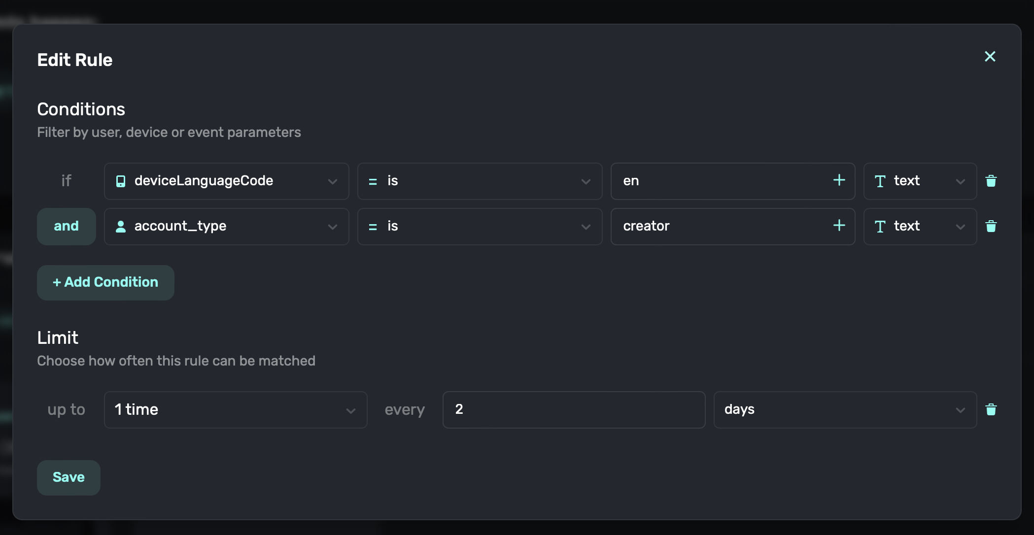 This opens the Rule Editor. Here, you can edit the rule to set conditions based on user, device or event parameters and set a limit to how often the rule is matched: