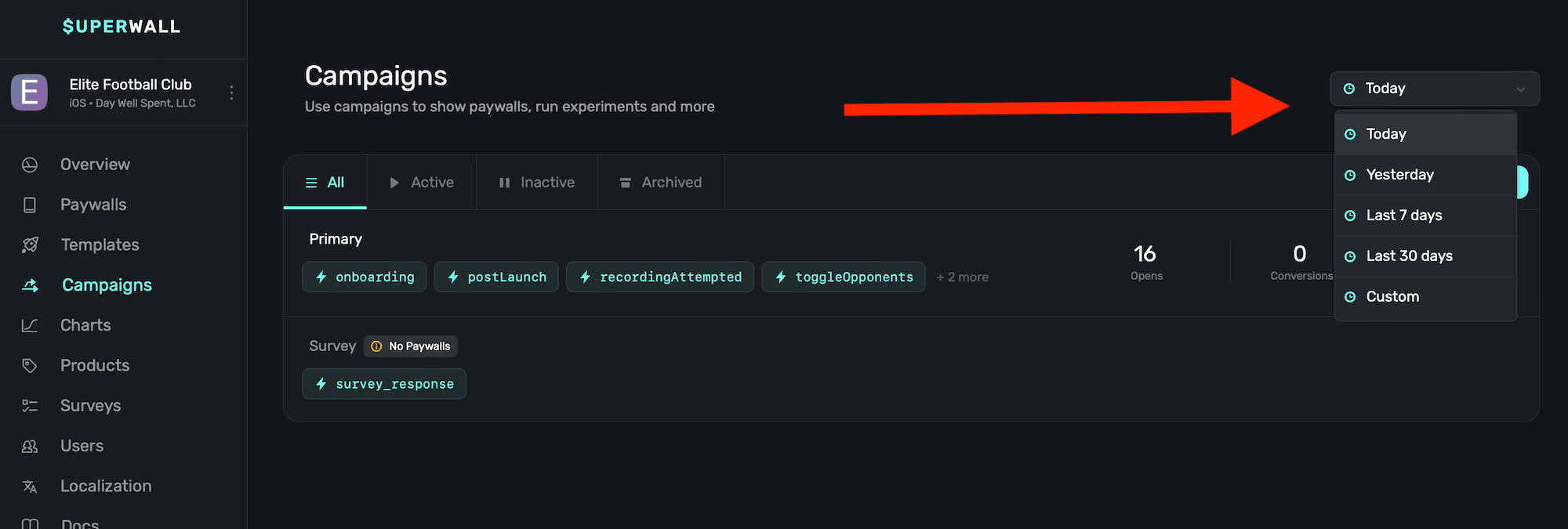 - Inactive: Campaigns that are not serving paywalls in production, but can be quickly re-enabled.