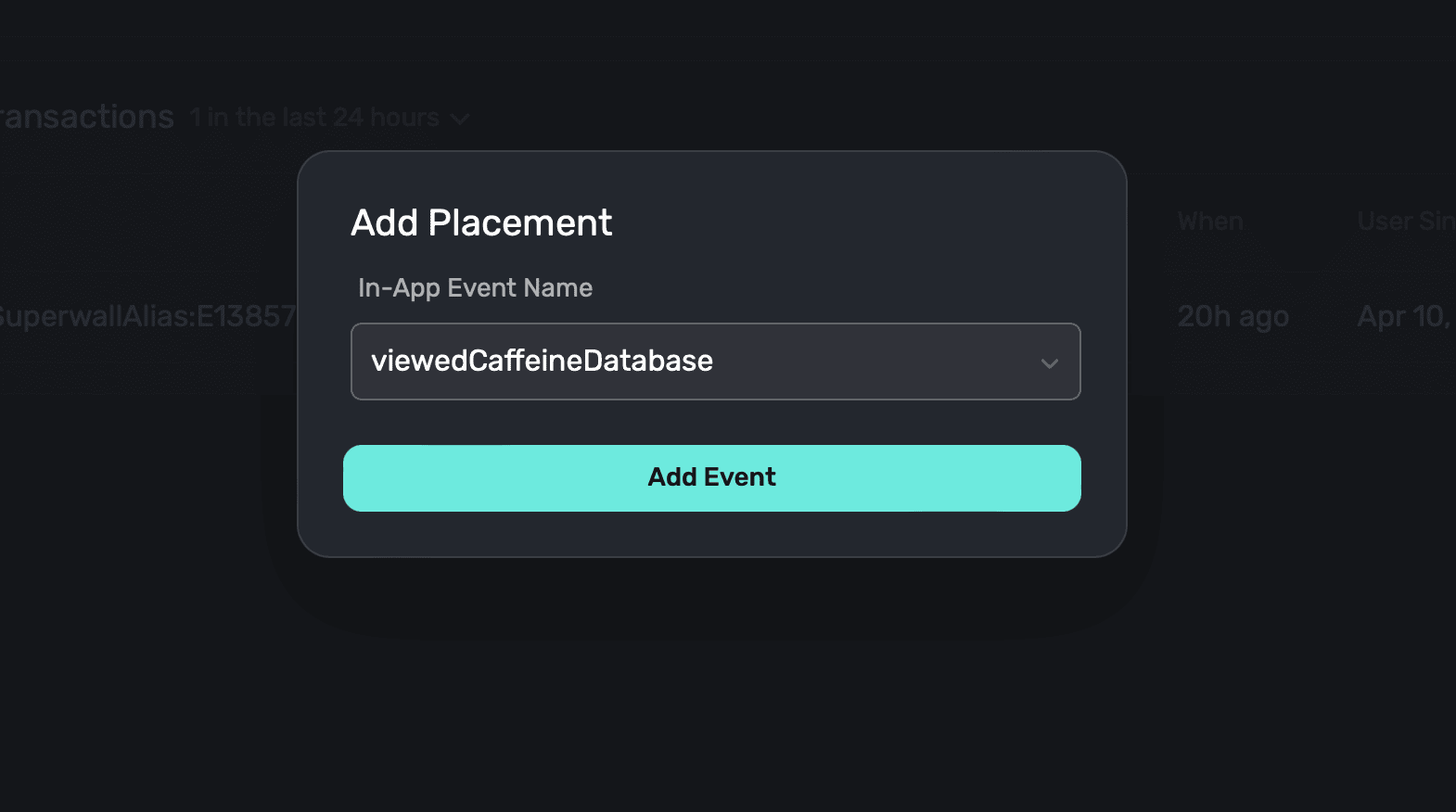 1. Create your own, app-specific placement: Here, you type in whatever event you want to use as a placement in your own app. In a caffeine tracking app, one of them might be when a user logs caffeine — something like caffeineLogged.