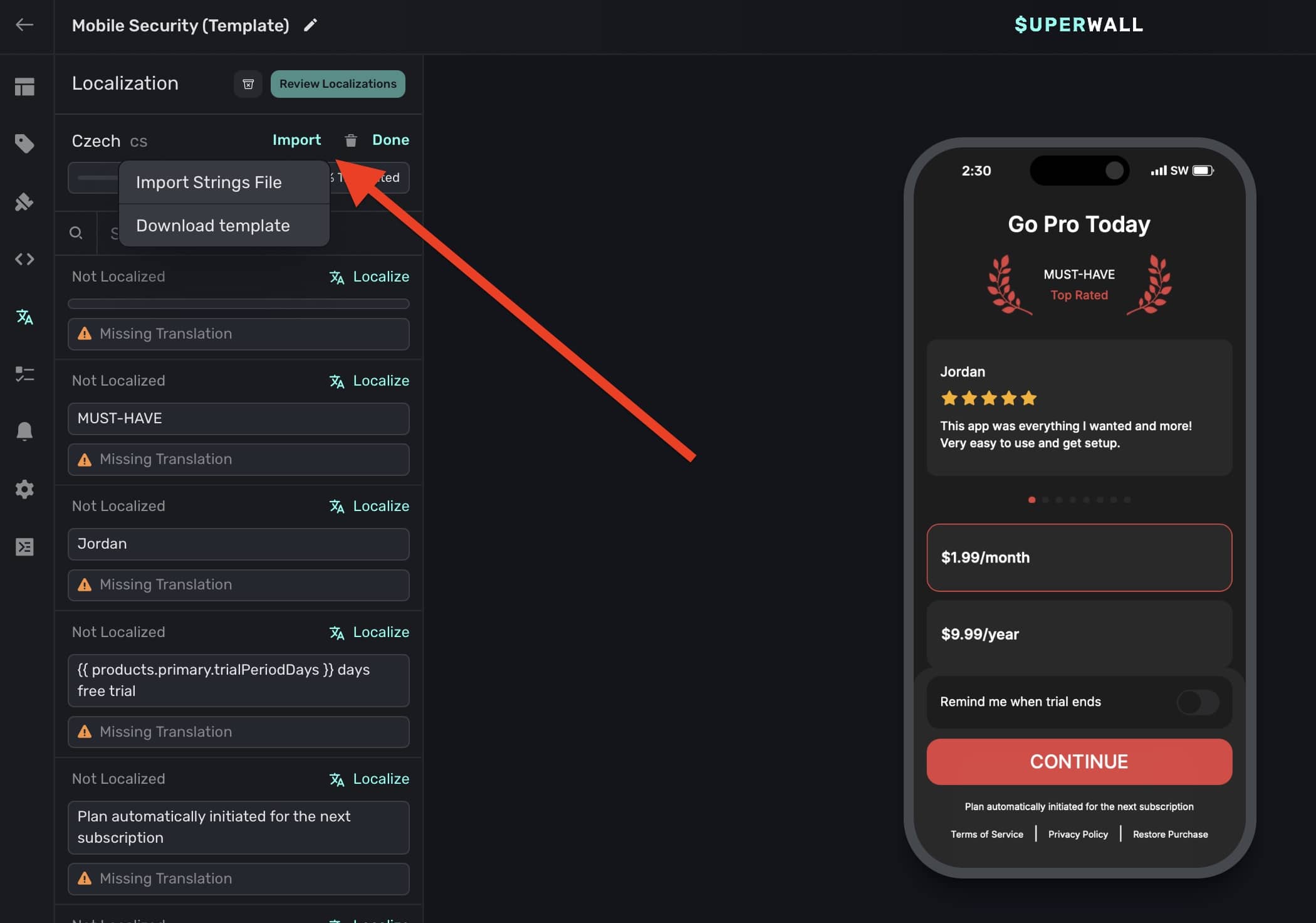 - Simple: Here, you can use AI to localize your paywall into any language. You can manually refine each value at any point. Quick and accurate.