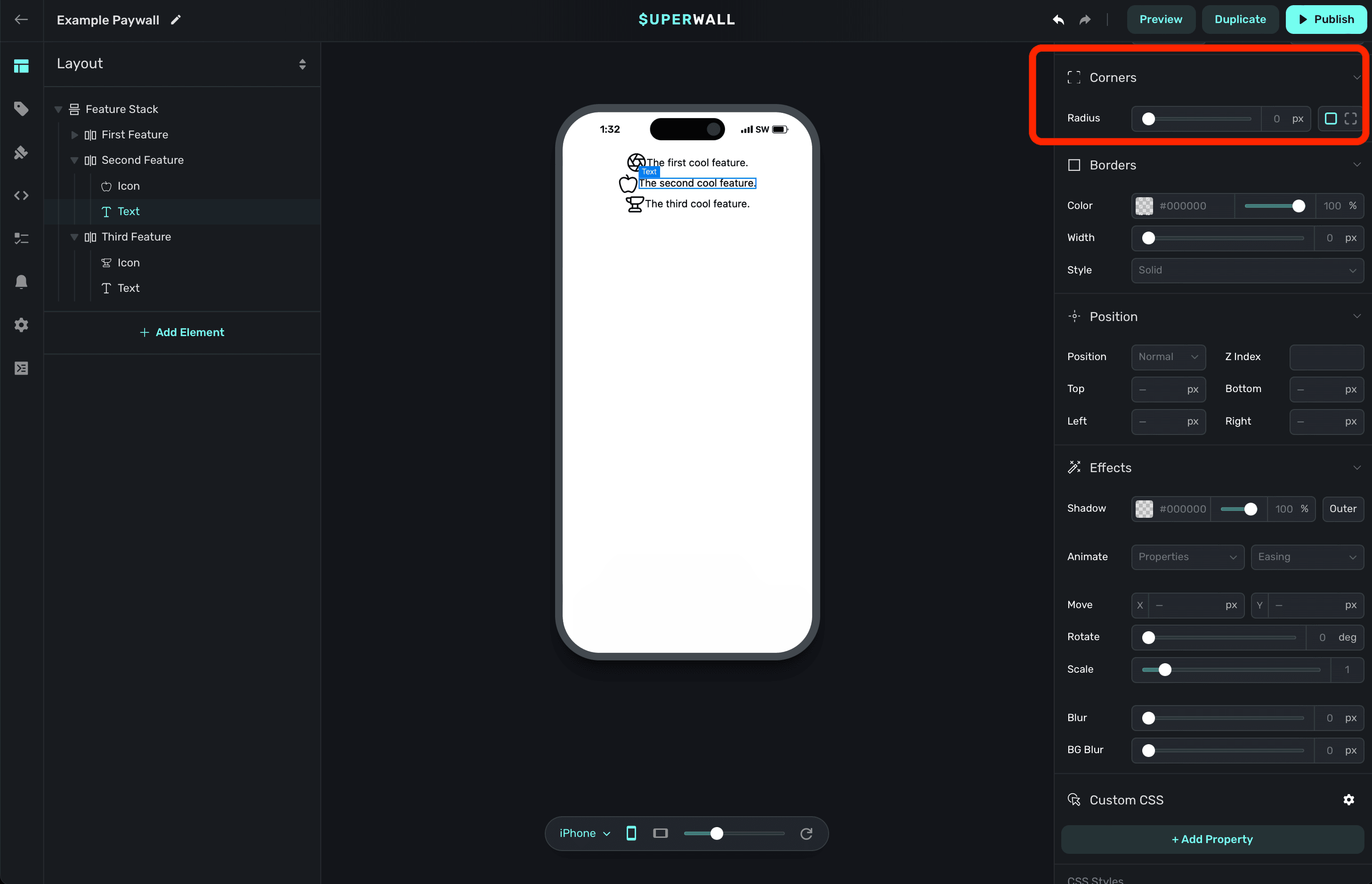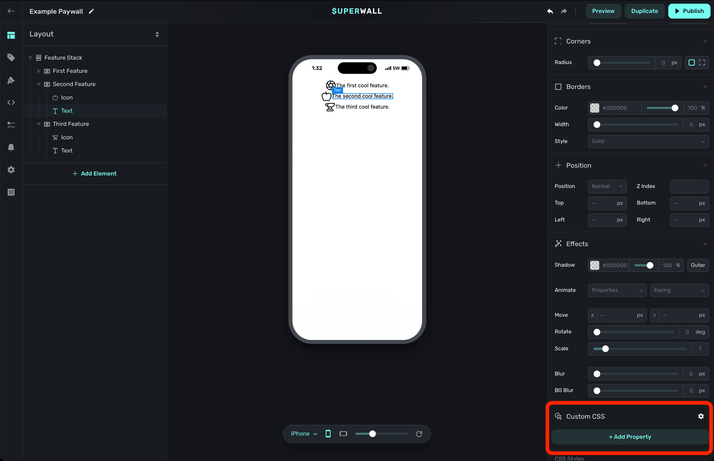 The properties below are editable regardless of which kind of component you are editing. The most important thing to keep in mind is that all of the properties below will work the same as they would on a web page. When you change these properties, behind the scenes — Superwall is applying the corresponding CSS code to the paywall.