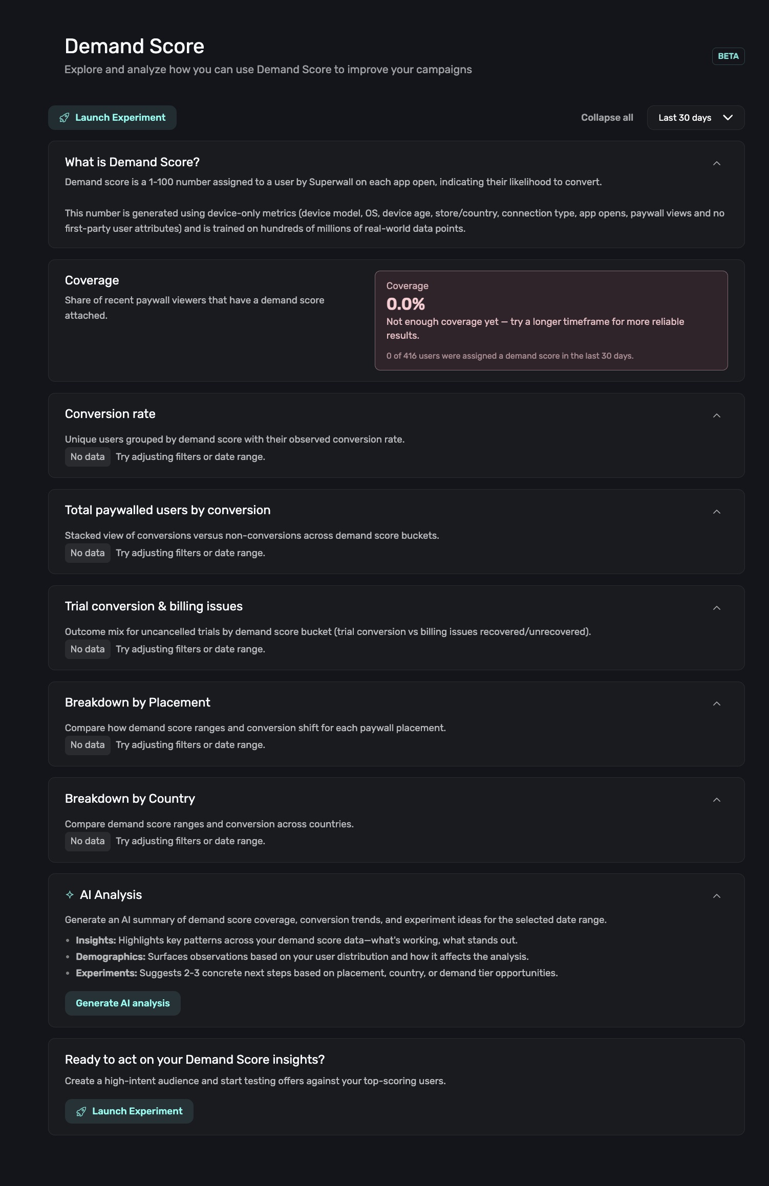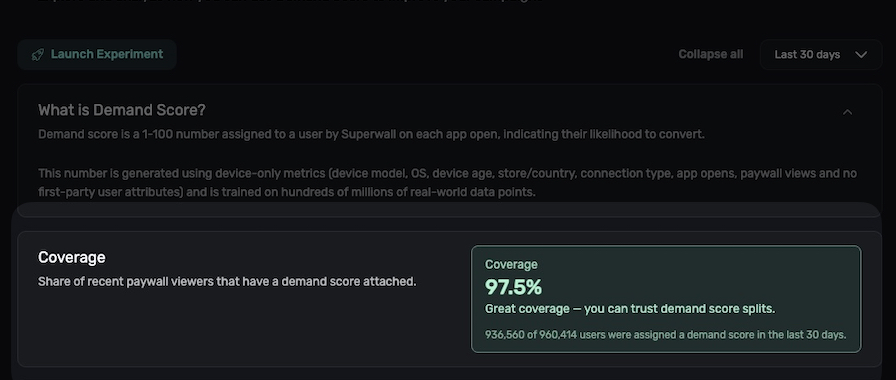 At the top of the Demand Score page, the Coverage card shows what percentage of your recent paywall viewers have been assigned a demand score: