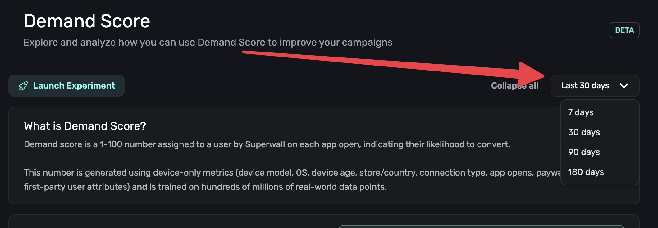 demandScoreto target users based on their likelihood to convert. - Launch experiments directly from the Demand Score page to create high-intent audiences with one click.
