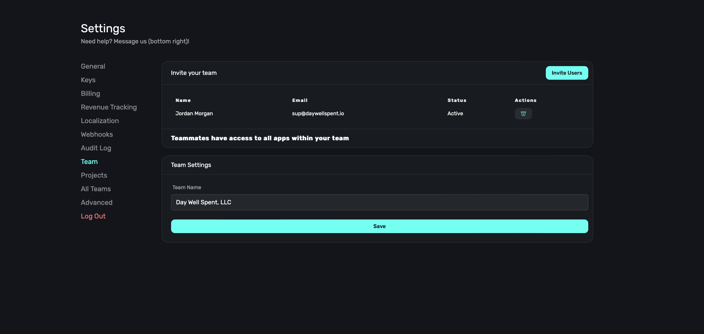 Once the user accepts the invite, they'll show up in your Team section. You can add or remove team members at anytime. To remove a team member, click the trashcan icon under Actions.