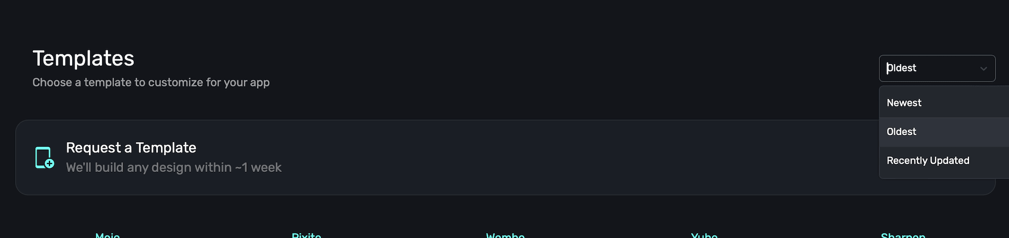 To sort available templates by date (either newest to oldest, or vice-versa) or by recently updated — click the toggle in the top right and make a selection:
