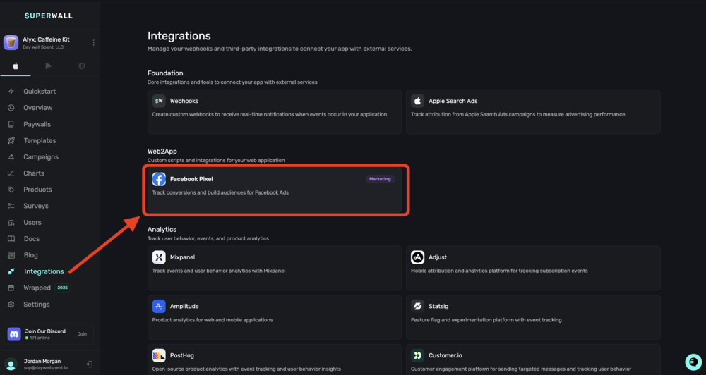 In the Marketing section within Integrations, you can connect your Facebook Pixel account to Superwall: