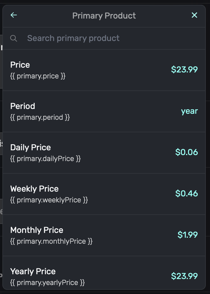 | primary | Product information relating to the primary product defined in the Product section | {{primary.trialPeriodDays}} days free then only {{primary.price}} per {{primary.period}} | 7 days free then only $89.99 per year |