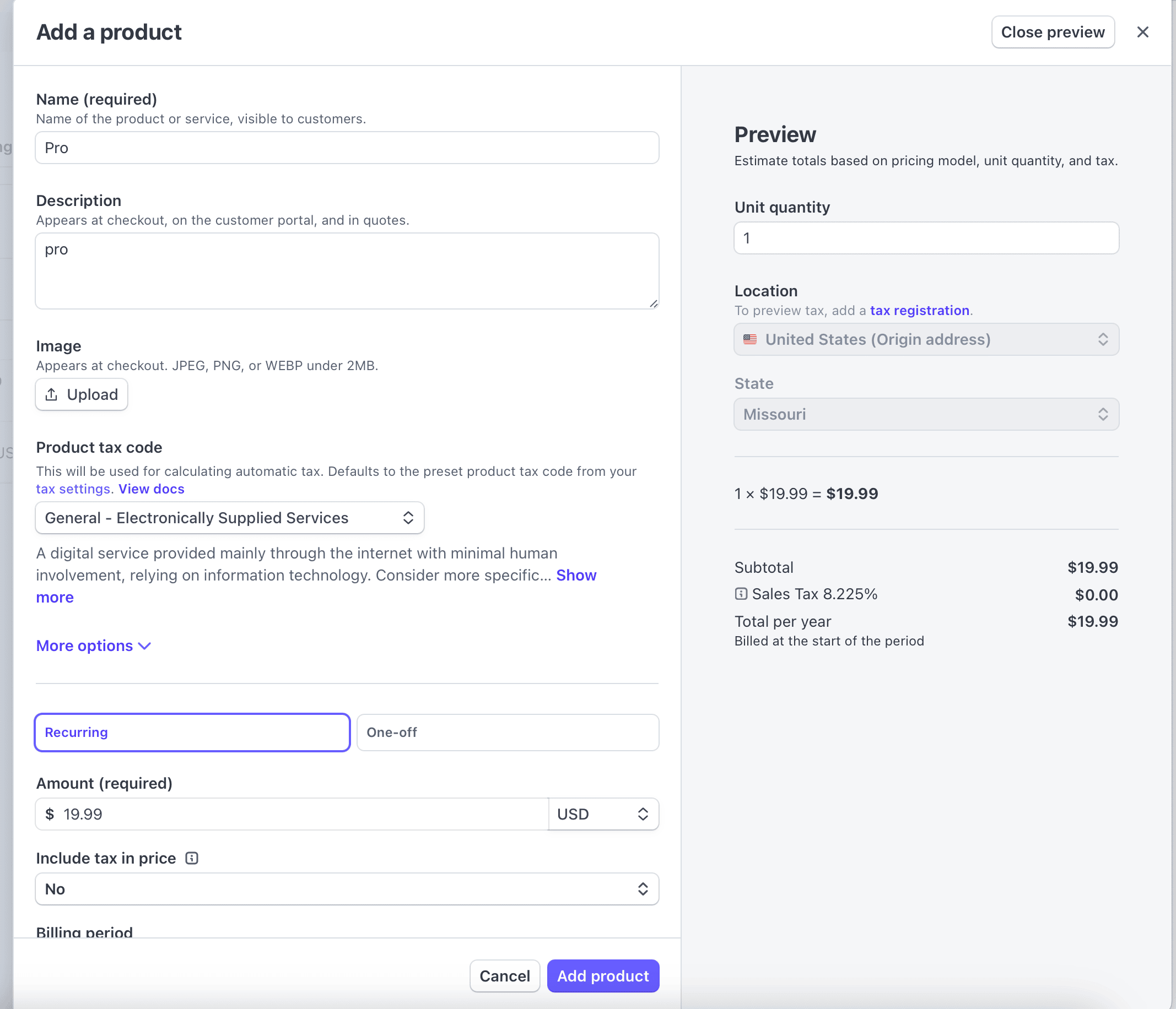 Once you've finished filling out pricing details, product name and all other metadata, click on the Add product button at the bottom right of the form. You should be redirected to your Stripe products page: