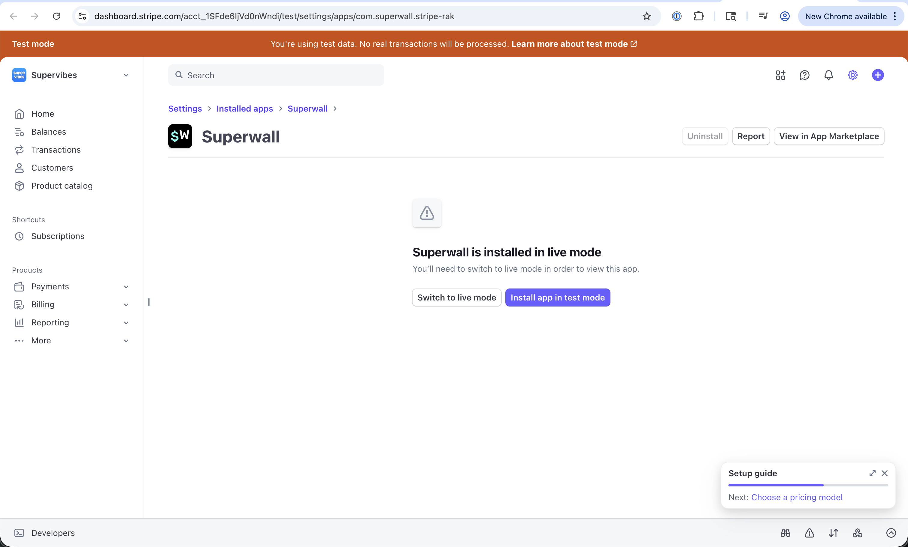 Navigate to the Superwall app in your Stripe dashboard. If already installed, find it under Apps: