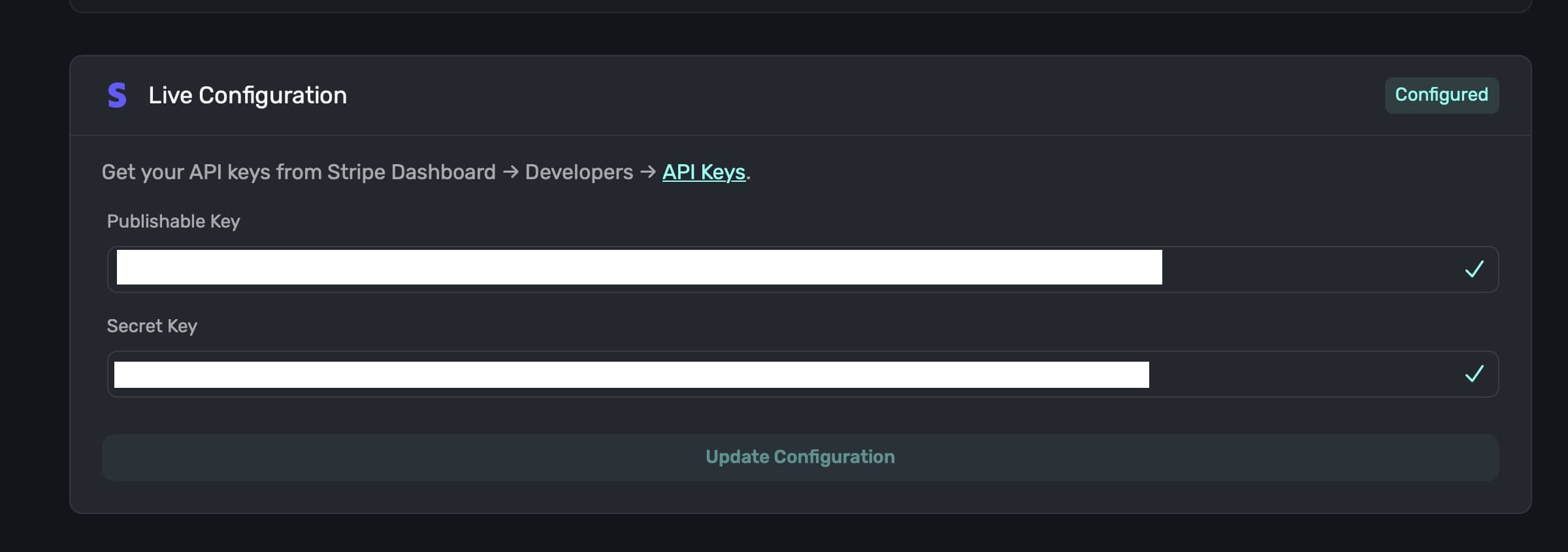 After installation, you'll receive a Publishable Key and a Restricted Secret Key with the proper permissions already configured. Copy both keys: